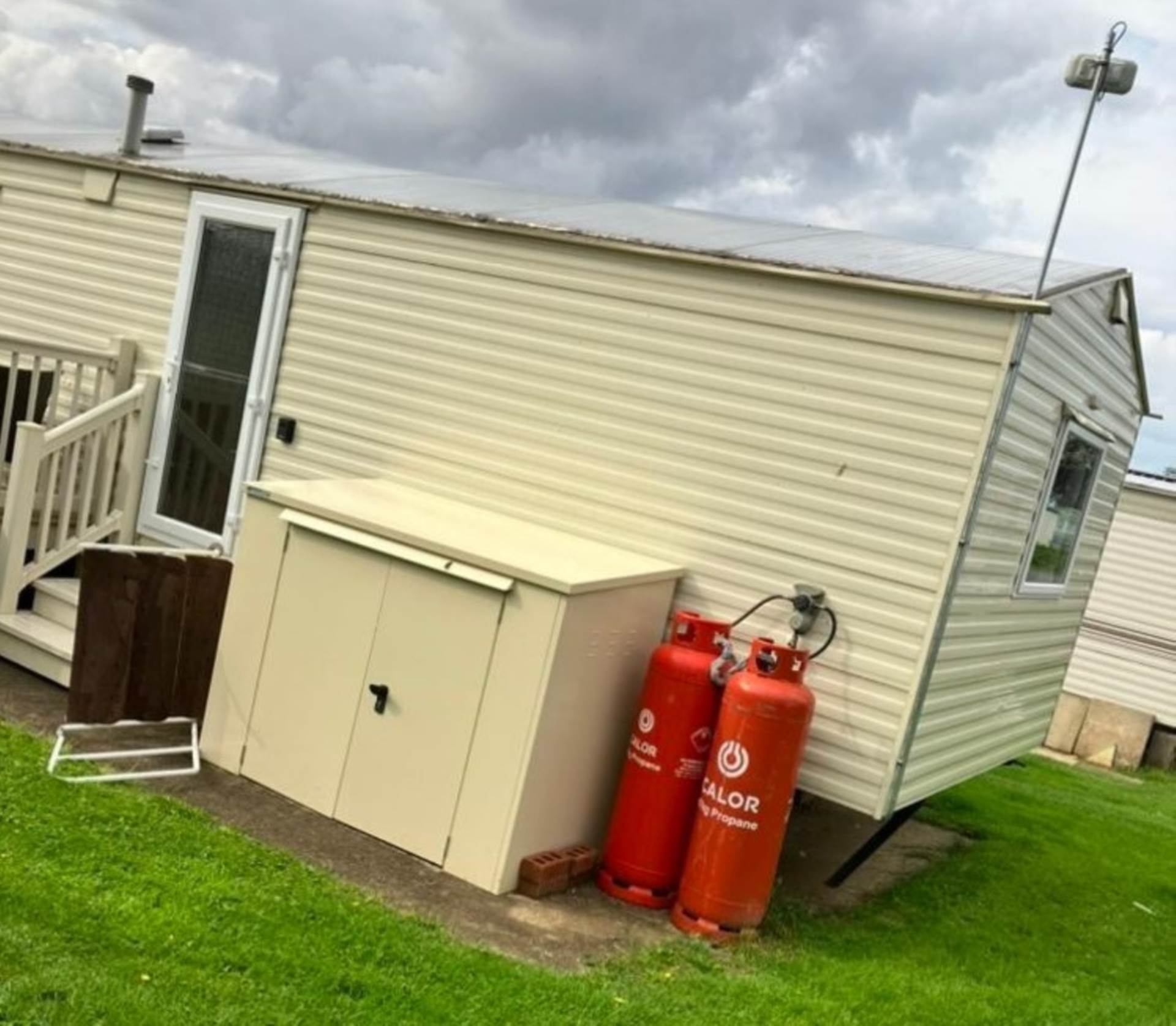 Outside has parking directly at the side of the van for easy access with a storage shed.